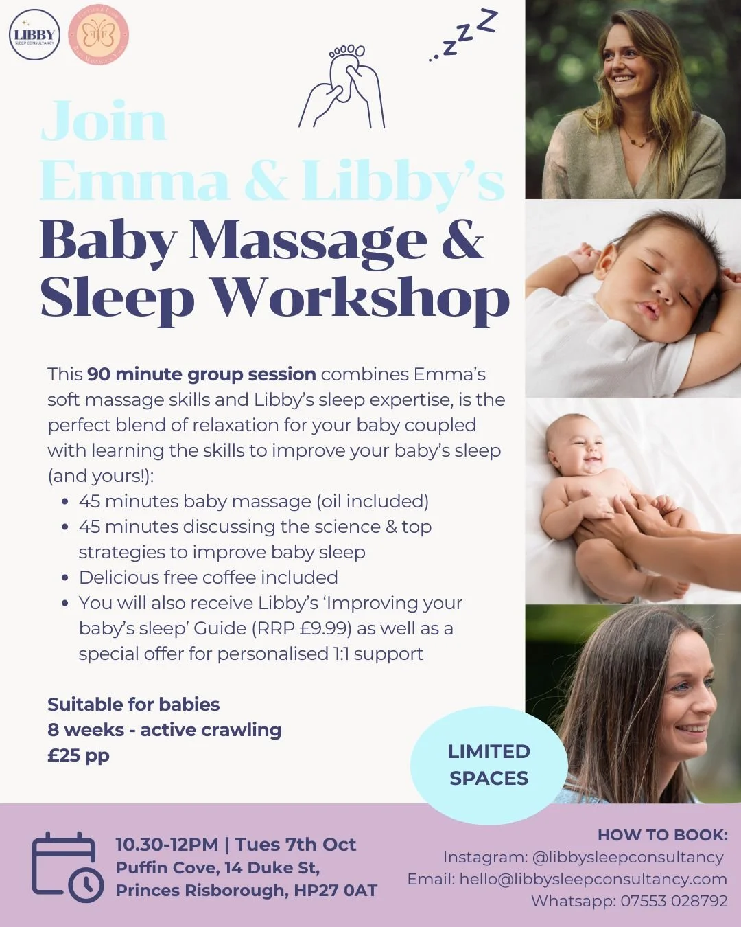 This 90 minute group session combines Emma’s soft massage skills and Libby’s sleep expertise. It is the perfect blend of relaxation for your baby coupled with learning the skills to improve your baby’s sleep (and yours!):